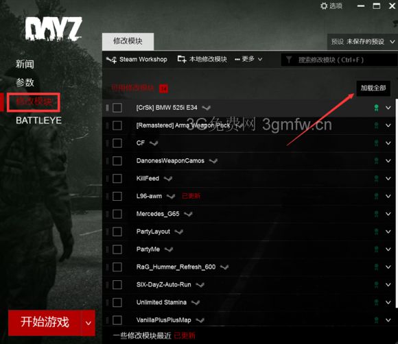 MOD名称:CF;[CrSk] BMW 525i E34;RaG_Hummer_Refresh_600;Mercedes_G65; KillFeed;Unlimited Stamina;DanonesWeaponCamos;ZomBerry Admin Tools;[Remastered] ArmaWeapon Pack;PartyMe;PartyLayout;VanillaPlusPlusMap;SIX-DayZ-Auto-Run(MOD为一些附加的武器、车辆和功能)