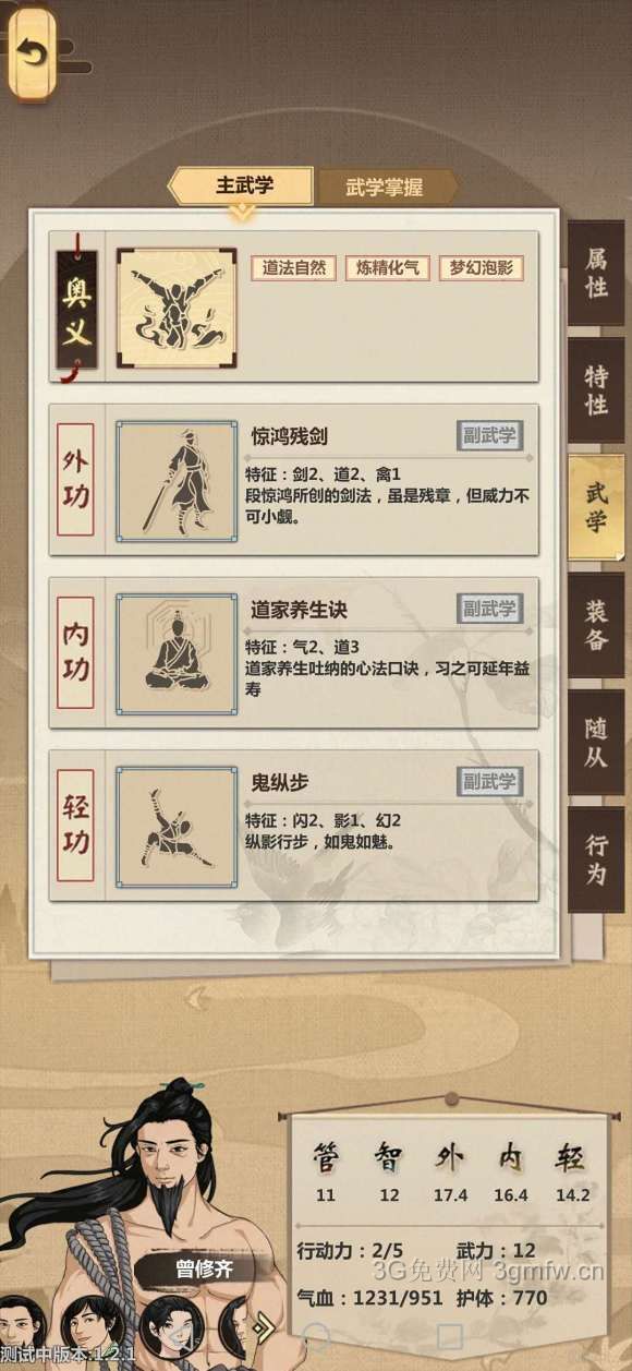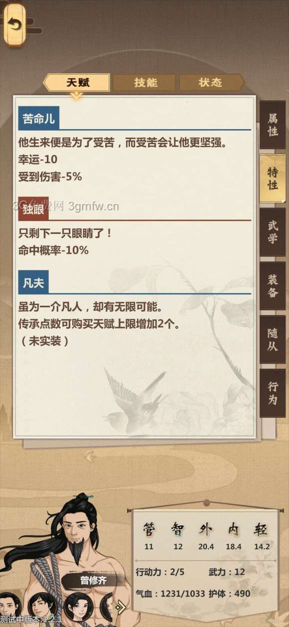在目前测试版本中资源太少,没法全部都培养,想要培养好人才也最主要是靠行侠,行侠事件中最好全派属性高的人去判定,因为判定轻微胜利经验+20点,而巨大胜利是+75点经验,后期甚至可以+100多点,一次事件就可以+1点属性,比去演武场锻炼+可怜的10点属性经验要多得多。