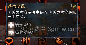 闪避回血并且移除自身一个症状(debuff),只要是闪避效果就可以触发,但是注意有一秒的内置cd。