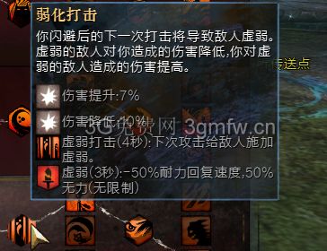 闪避后下一次攻击会给敌人上虚弱,对付直伤职业时非常好用,注意特性中写的闪避是指翻滚。