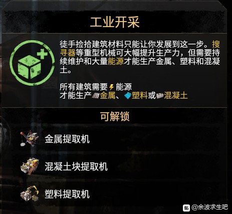 “工业开采”3种提取机需要电和一个工人,还有,要建在地下资源上方。