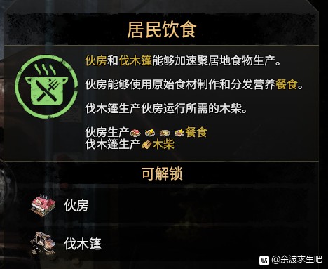 “居民饮食”伐木蓬可以容纳两位工人,移动工作区到有树木的地方产柴火,伙房一位工人用柴火和食材(土豆玉米胡萝卜圆菜肉鱼虫豆花生,小麦走磨坊出面粉,面粉走面包房出面包)。