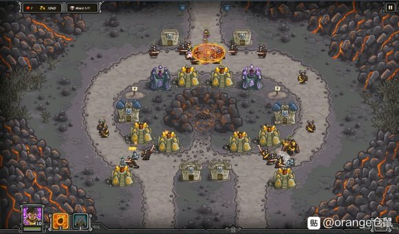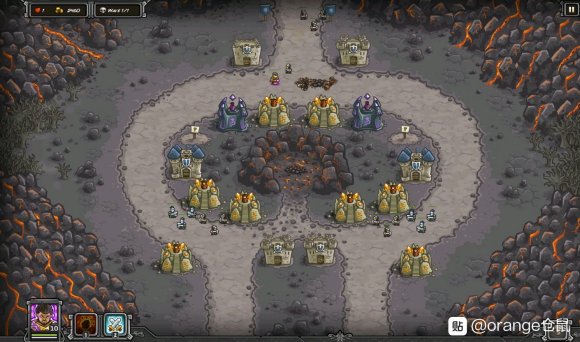 由于第一次打本关经验不足多次漏怪......本关会出大量的物抗怪,前面一波土狼,右路较多,要用火雨砸。本关一有钱就建魔法塔,越多越好,后面怪的数量会超乎想象,图中就漏了一大波的黑暗屠夫,只能用火雨解围,所以火雨留着以防万一。(留火雨,一直建魔法塔,裸塔即可)