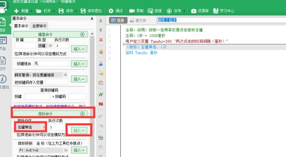 选中右边的(鼠标左键单击1次)语句,找到左边的鼠标命令,点开,选右键单击,执行次数1次,插入。