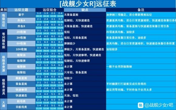 最后是常规资源的获取,舰r资源一般通过远征获得,也可以氪金但并不推荐,这里贴一张刚盗过来的图顺便感谢一下做这张图的大佬