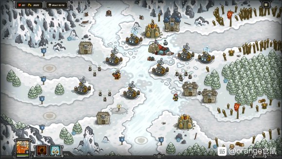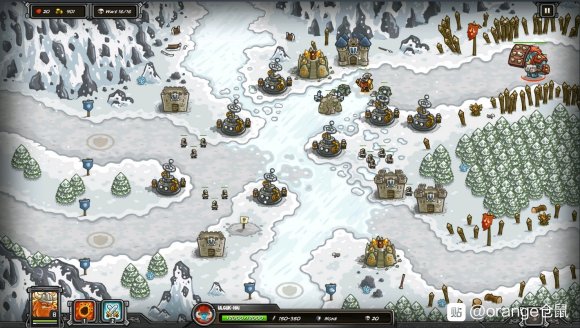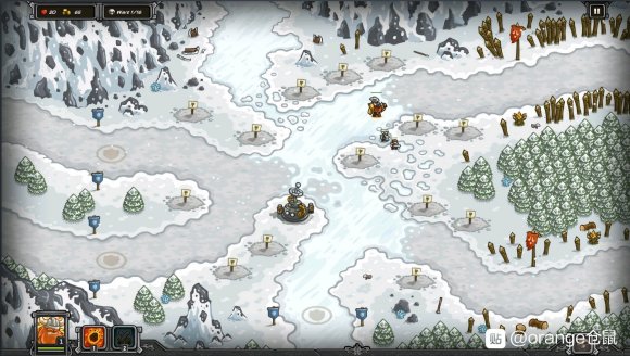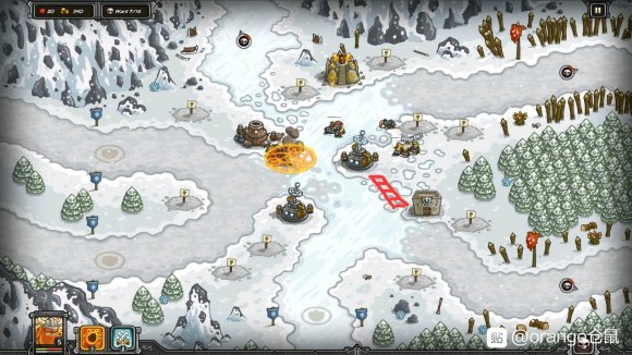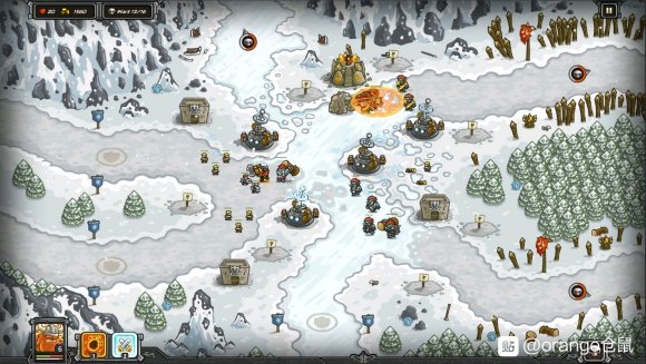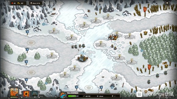 要在滑冰巨魔经过的一片空地将它们拦截下来,一让它们回到道路上就会直接冲家。在上面建一座兵营,英雄大部分时间也在那拦截,援兵放在图四画红线的位置,既可以攻击滑冰巨魔,也可以攻击下方到来的怪。持木巨魔必要时可以拿英雄阻挡或者用火雨攻击。