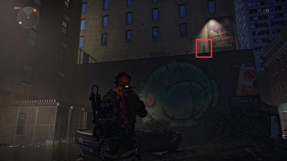 来到上图我标记的位置,环顾四周,将会看到一幅非常显眼的涂鸦壁画(仙人球鱼?)壁画顶部有一个可以用子弹打下来的挂绳(仔细瞄瞄,判定点在挂绳绳坠底部)