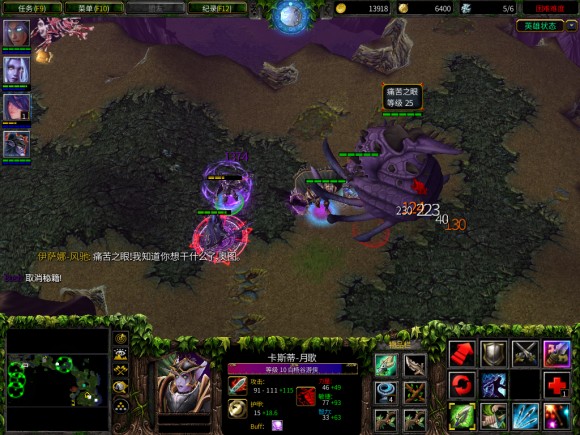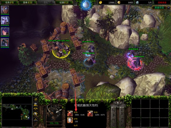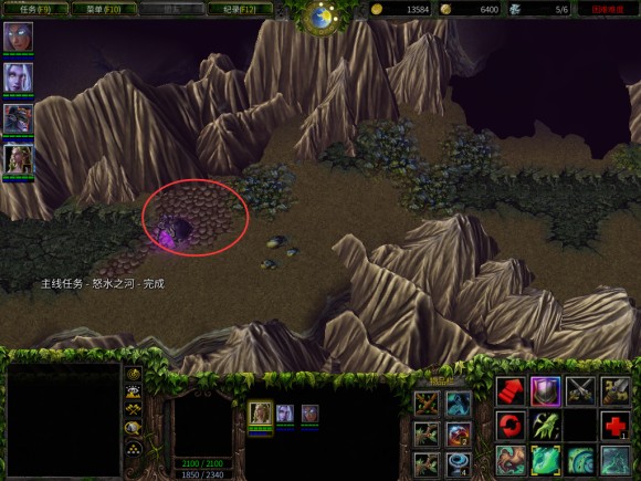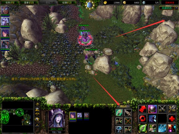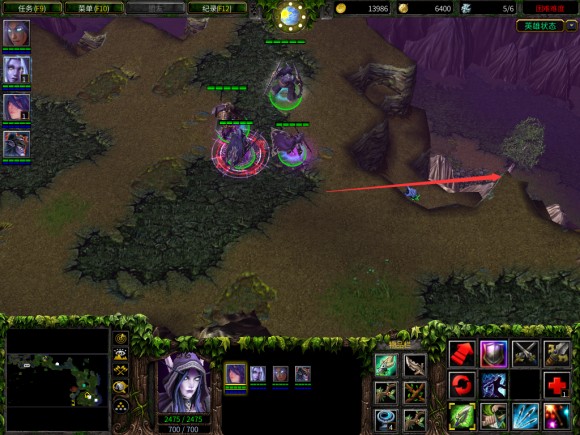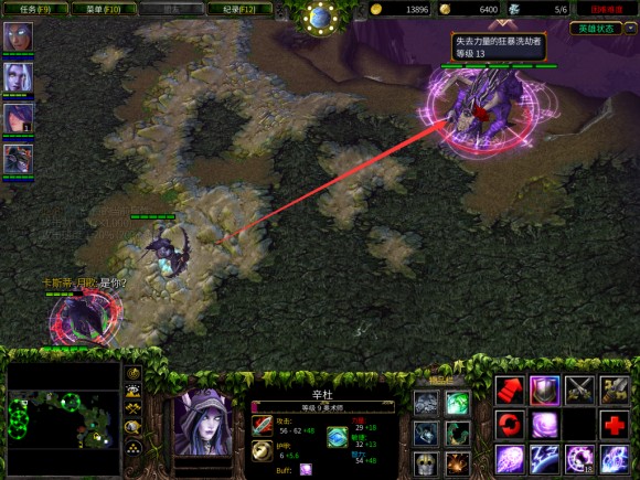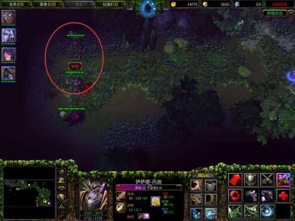 此处异化堕落古树,需要按M把英雄移动到红圈内攻击它,不然远程攻击会使他回血,掉落【枯木杖】,会加【森林之泪】点数。