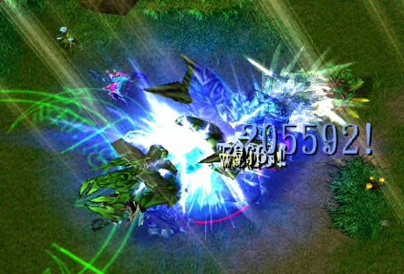 (上图中较大的蓝色字体200592为纯粹伤害,密集的较小的蓝色字体7000多是1.5s内每次攻击所附加的敏捷*1的魔法伤害,黄色小字是装备异端审判的额外伤害。)
