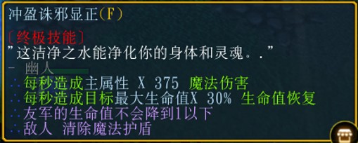 施法前摇1s后(如果在前摇过程中取消,则技能会进入CD),发出一道超长水柱,对沿途敌方每秒造成敏捷*375的魔法伤害,并且清除敌方的各种护盾类技能。同时对沿途友方造成每秒最大生命值*30%的生命回复,并且锁定最低血量为1,即免疫伤害类技能致死。需要持续施法。