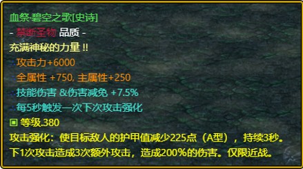 这个神器不用多说,加攻击力可以增加Q的纯粹伤害,加全属性可以提升D技能被动回复和W技能后续回复,还加伤害减免和技伤。其被动更是逆天,减甲和额外3次攻击,对于幽人是如虎添翼。当然,我还没有打到白牛这个阶段,只能眼馋一下。