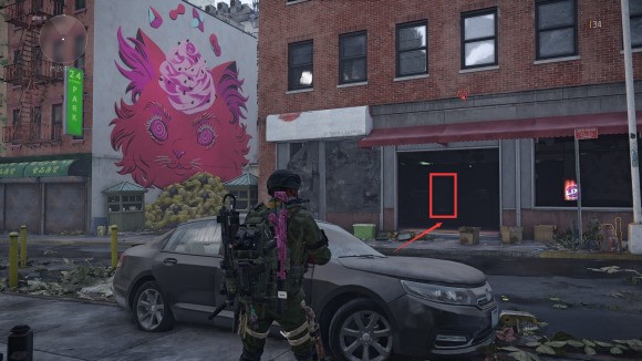来到上图位置,会看到如下图左侧的一副巨大的猫主题涂鸦。