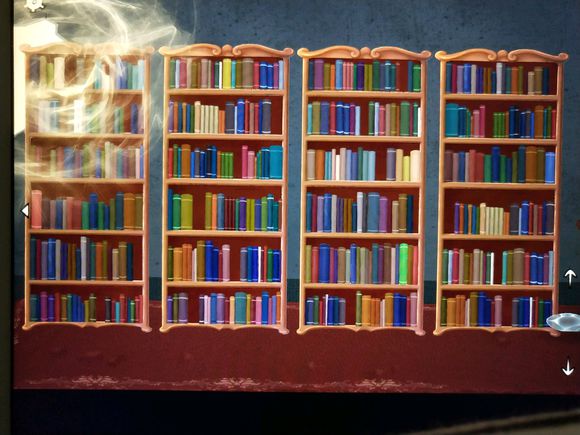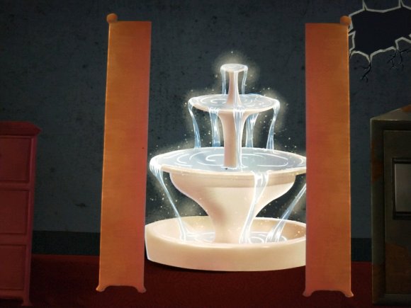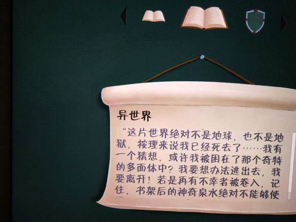 用拿到的房门钥匙开门,回到书架房间,将密码锁如图所示排列,打开柜子拿出书,如图所示把黄色绿色书按之前的顺序放在书架上,向右转视角,看到一个喷泉和一个碗,拿碗乘水,如提示所示,填补墙壁漏洞,全部填完出现黑色方块,通关!