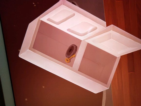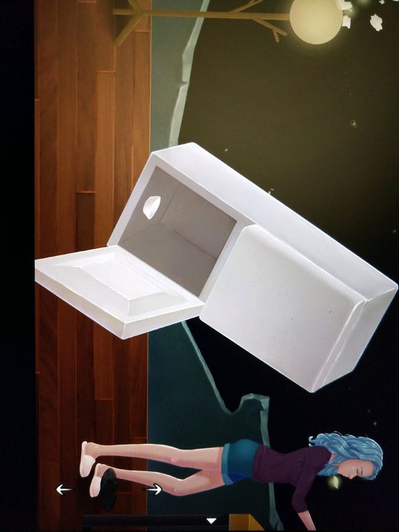 用简易放大镜放大相框的右下角,看到关灯才可以出去,这时关掉灯,向左转捡起口红,递给镜子边的女主,然后点击水槽,有一把刀,向右转,把刀递给女主,这时出现一把柜子钥匙(全过程必须要快速,等屏幕完全变白就会死掉,过程中可以点开灯,防止被黑暗吞噬)拿到柜子钥匙后就可以开灯了,打开柜子门,拿出撬棍和书,用撬棍打开冰箱,拿出旋转锁扣,这块截图不全,因为来不及截图了