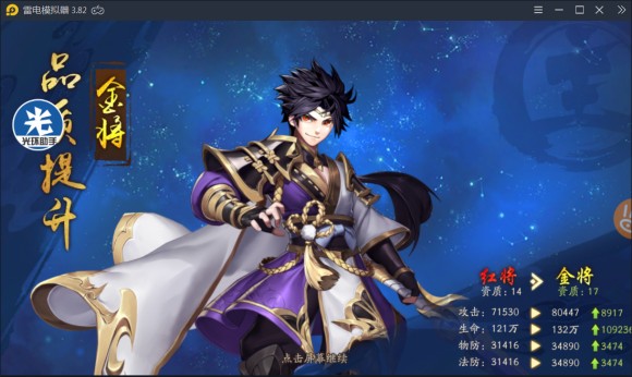 附上升星后的图,我的抽卡脸实在是不忍直视,开服到现在350抽没一次双红,所以我武将的星也特别低,除了赵云当时在玩蜀国阵容里很早的几个五星,其他都非常拖节奏,因为是独宠和前期的一些浪费,战力不会特别高,但我68级8千万战力的时候主线是打到100最后一关,现在70级1万2推到111,预计卡在115,每一章第五关都是大关,难度会比其他小关要大很多,除非是卡星或者卡品,基本都能很轻松的过,多刷几遍就达到那个爆率稳赢。