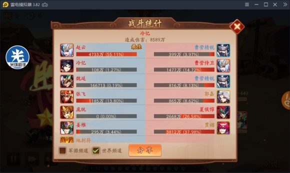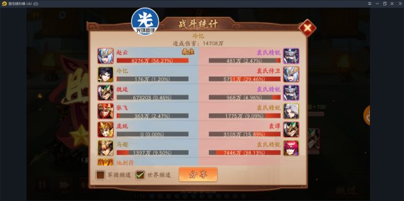 过星总伤害大概是14500万,单赵云8276万。这次对位我是将马超和庞统放在最上面,然后张飞赵云对贾诩,主角和魏延放中间打间隔控制。