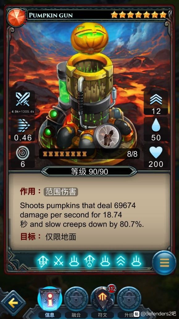 火山塔的升级版,伤害更高,有几率燃烧掉怪物的尸体不稳定,毕竟扔出去的是南瓜?弹药,不像火山一样扔出的是火焰?炮弹,问题不大,符文搭配建议堆威力(可按照我的符文搭配方式来搭配)南瓜塔的伤害主要靠的是南瓜的燃烧伤害,所以我带的是3个威力(也可以带2威力1时间伤害面板数值会看起来要高一些)实际秒伤我觉得全威力应该是更高。