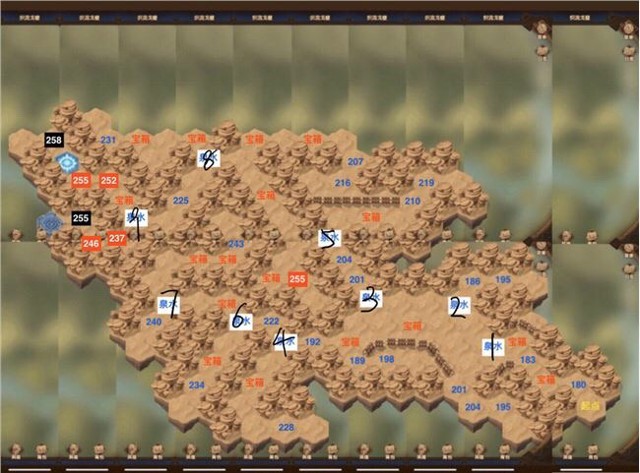 路线三:打222,吃泉水8,打左上225,吃泉水9.打237,打246,「246 可能打不死,但是能打残血,吃泉水6,拿箱子。」