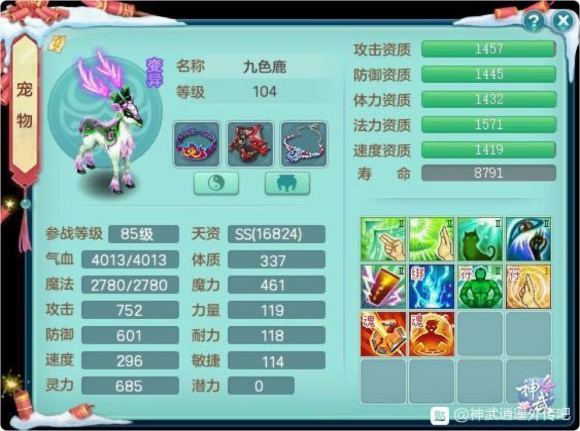 2.进阶级别玩家宠物配置:①以上物理纯盾宝宝必备(出场看对方) ②全血加点法术肉盾宝宝(高级再生 高级援助 高级幸运 高级神迹 高级灵敏 高级强壮 高级水吸收或者高级雷吸收) ③血耐吸血连击宝宝(最佳加点为950~1000防御,3200血) ④暴力翻江倒海雪舞(750灵力) ⑤三维剑气宝宝 ⑥审判群法宝宝(见下图) ⑦暴力隐身连击宝宝