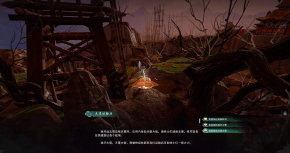 3、回到副本入口,左边上坡,点击天策运输兵对话,直接飞“天策大营”。普通血战天策与25人英雄血战天策不同,英雄血战天策需要飞两次才能到天策大营。而10人普通血战天策,则可以直接飞到天策大营。