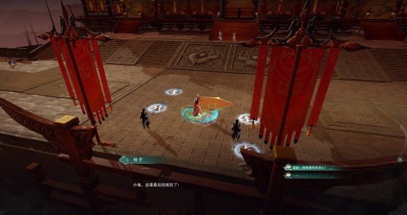 言归正传,直接飞到天策大营,直接上台子找杨宁开剧情,点“是的!我有誓死的决心!”什么?还没开阵?还没清小怪?不急,不急……在每一个新CD第一次开剧情的时候,杨宁都会来一波嘴炮杀。在嘴炮杀的这一段时间,你有时间打坐,开阵,切奇穴,甚至还能抽空把两边的小怪清一下。(这里建议只把杨宁左边的小怪清掉就行了,左边的小怪,在刷巫医的时候,有可能被群到。而右边的小怪留着还有用。)