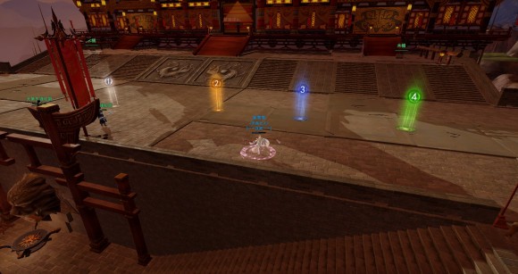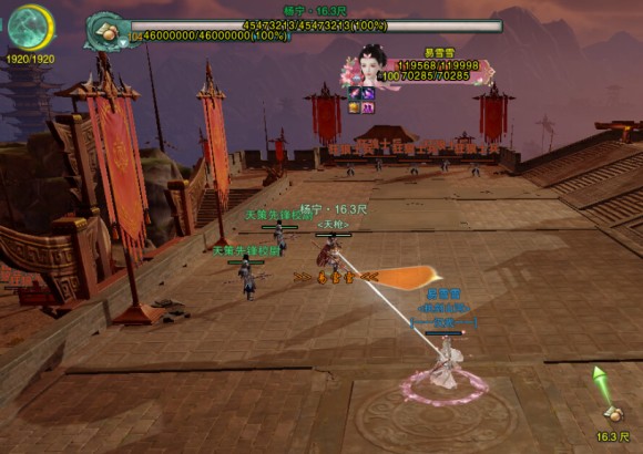 ①号点:第1波小怪开怪点与近战小怪拉怪点。站在这个点拉住近战小怪,运气好的话杨宁出手可以一招拍死全部近战小怪。(杨宁在自身BUFF“铁牢罡气”30层的时候会出手,释放炎龙出世,范围AOE,伤害大约能够把普通小怪拍到丝血。)