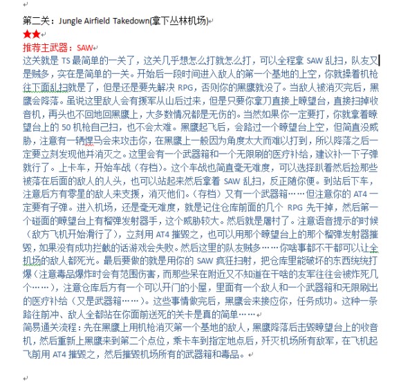 (接)先在原地用望远镜观察对面的港口,应该是能看到一个RPG和2个AK杂兵,全干掉。(存档)然后来到最后一个村庄门口,赶紧躲到村庄门口的石头后面,建议丢完5个手榴弹进行无差别轰炸,并小心地击杀门口能看到的人。接下来,建议不要从正门进入村庄,否则四面全是敌人,直接被夹击。所以建议从栅栏旁边进入村庄。如果你比较怂,那么可以直接在运输快艇上安C4引爆,但是这样很可能会最后弹药不足,所以建议不要这么玩,这个村庄共四个50机枪手,两个在正门口,两个在后方,自己开地图看。有一个机枪手旁边有医疗补给和武器箱(子弹终于够了)。还有不少的RPG,是个典型的巷战,还是QE大法把。建议把这个村庄清空了再炸船。注意此处的BUG:给快艇安C4后最好原路(木板路)返回,不要游泳上岸,否则最后黑鹰可能不会降落。炸完船后,敌人的援军到达,包括悍马车。(存档)与进村庄一样,从侧门出去,先消灭悍马,然后丢光5个手榴弹进行无差别轰炸后再前进,注意森林里的RPG一定要找到尾焰的来源,将其击杀,杂兵的话就没那么麻烦了。到了露天点位,等待黑鹰降落,任务成功。(注:G36的子弹用的很快,所以一定要节省着子弹打,不要到最后一个村庄前就没子弹了。本关能补子弹的地方应该就是那个武器箱的地方了)
