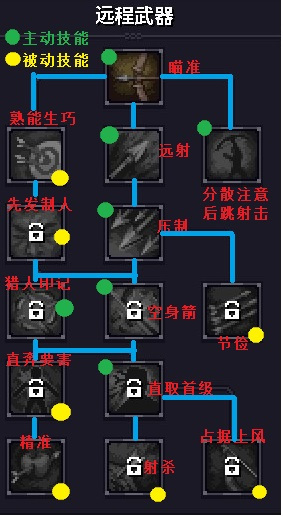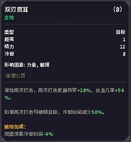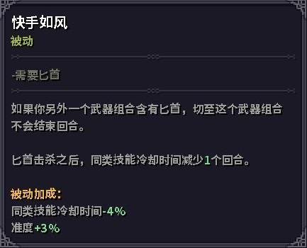 目前我这个角色9级。我给了两点技能点给匕首用来防身,一个必须点的{双刃贯耳},这个没啥好说的。我是副手双小刀,而不是小刀+盾。配合{快手如风}即使被近身到1格了,马上切匕首不费回合+{双刃贯耳}高伤糊脸,毕竟弓箭手加了很多敏捷,附魔也堆暴击爆伤准度,切双刀近身也不是不能打。不推荐匕首+盾是因为盾一般都减少闪避,少一些防护搏一搏输出也不是不行,前期比较脆可以考虑带个盾防猝死。{快手如风}被动效果还+3%准度还是蛮不错的。