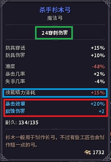 装备选择这一块基本上没有太多讲究,一般来说附魔会出很多精力回复,精力的效果。如果觉得缺精力的话选择哪个22伤害的技能消耗不高的弓,不缺精力就哪个伤害高上哪个。商店装里面曼郡还可以买到26伤害的长弓,比这个还高2点。