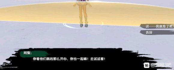 阿梨不在原来的位置了,在习武场,和阿梨对话,让我们也去跳,我就免了吧