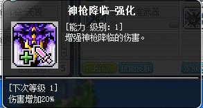 至于为什么是伤害必点而不是另外两个,因为有的人可能自身装备潜能就自带极高的无视,或者有的人觉得10boss的加成不够明显(事实确实砍的有点过分了,别的职业超技都加20boss,黑骑天生0boss还只加这么点),并且神枪的三个超技并不体现在面板上,属于技能自带的超技。因此相对于宝贵的5点可支配点数而言,神枪20伤害的性价比是最高的。
