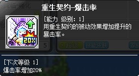 这里注意不要被名字骗了,这个重生暴击是被动,也就是不用进入重生状态,点了就直接在面板上增加20的暴击率。对于一开始0联盟无link单角色的初创号玩家来说,暴击是不够用的,而加了重生暴击可以在前期比别的职业更早的享受满暴击带来的高伤害,从而极大的提升游戏体验。我本人也是加了大半年的重生暴击后,不断完善自身底子才最终舍弃它的,对于部分平民玩家来说该超技可以陪伴很长的冒险时光。而到了后期随着link联盟装备等的提升,暴击率够了,自然就可以舍弃它去加其他选项。