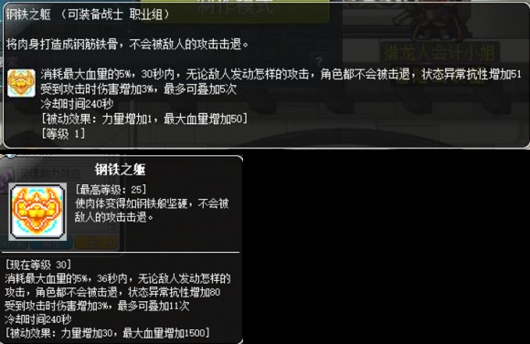 战士系五转通用技能,钢铁之躯。也就是真泰山技能,泰山就是所谓面板上的稳如泰山,战士系职业群都是100。然而,特定怪物(几乎所有boss)的部分技能(最典型的就是推人)却可以无视这种面板上的百分百泰山,因此自身的满泰山一般称作假泰山。