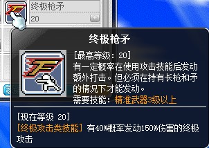 先来看描述,二转时已经介绍过终极枪矛了,作为一个全职业基本都有的终极攻击类被动,技能本身是没有任何问题的。但是实战中这个所谓40%的触发概率,恐怕实际有没有4%的触发都不一定。因此,实战中极低的触发概率导致了终极无论在任何时候,都是鸡肋一般的存在。