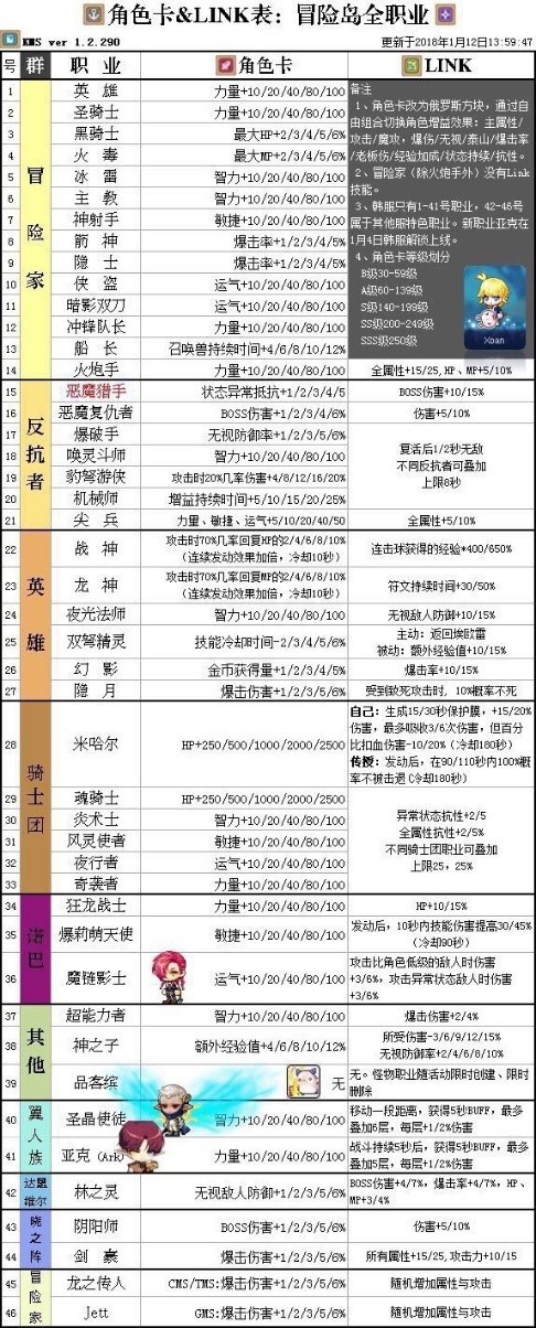 这里放一张全职业的link及联盟角色卡属性图,鉴于当前冒险岛6000联盟(全职业140级)才到及格线(解锁全部区域),8000联盟(全职业200级)则是平均水平(填满三种属性),因此不需要纠结该练哪个,哪些先练,全部都练到200就是了。