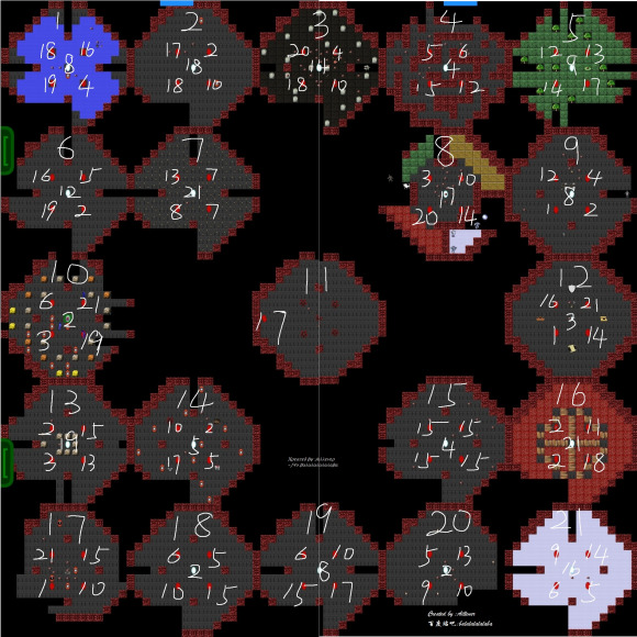 先说一下迷失之庭的机制吧,如图中有21个房间,除了11号神器房间之外,每次地图生成时其余的20个房间会进行随机排布,而且 每个房间也会进行旋转!!!每个房间也会进行旋转!!!每个房间也会进行旋转!!!(重要的事说三遍,以防有人不看仔细说我做假地图)