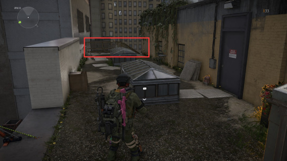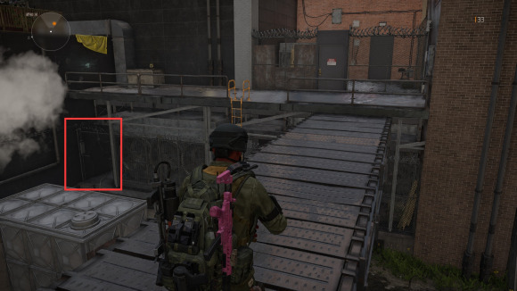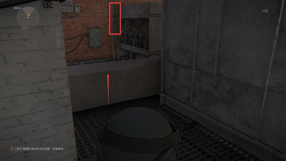 方框处为吊绳位置,我们再进入门后需要沿着脚手架楼梯向上走,并使用挂绳到达楼顶。