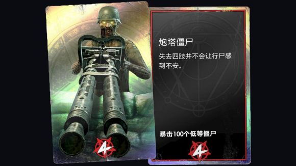 使用地图上固定的重型机枪对幸存者进行扫射的普通僵尸 这把重型机枪足以把你打成蚂蜂窝。有这样的僵尸存在也算让人谅解为什么幸存者一直都攻不进僵尸的占地。