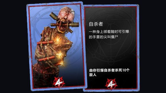 伴随着僵尸部队玩家本能性敏感的叫声,自杀者捆携着大量炸药随时准备发动自杀袭击。区别于前作宛如神风敢死队的着装,这一代的自杀者变得更疯狂 但速度也更慢。利用他们来处决更多的亡灵,要用疯狂来打败疯狂。