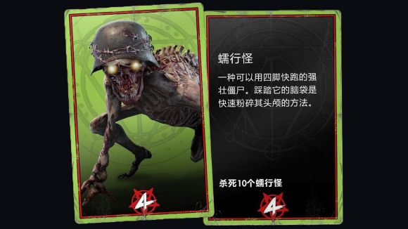 依靠四肢和爪子在墙壁天花板上爬行的僵尸 拥有强力的弹跳能力和行动速度。拥有扑击和抓击两种攻击方式。当大量蠕行怪一同朝你冲来时一定会让你觉得头皮发麻。