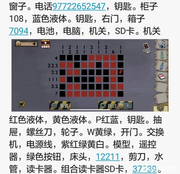 红色液体,黄色液体。P红蓝,钥匙。抽屉,螺丝刀,轮子。W黄绿,开门。交换机,电源线,紫红绿黄白。模型,遥控器,绿色按钮,床头,12211,剪刀,水管,读卡器。组合读卡器SD卡,37739。