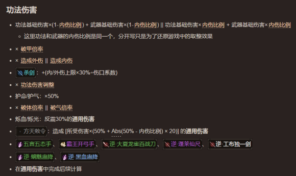 概念:虽然看起来wiki写的比较复杂 实际上就是单纯的 功法伤害+武器伤害(如果想计算内外伤就乘以内外伤比例),分开写是因为严谨小数点取整问题,咱们自己算的时候直接先加再乘就好