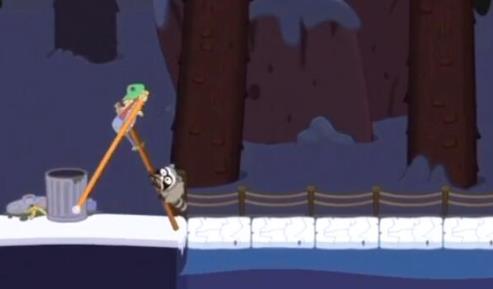刚开始的时候抱腿小浣熊会突然出现,大家只需要保持节奏快速走过冰面就可以了,之后大家需要滑走,记住多跳一下你能走的更远哦,不要把鞭炮碰到前面,如果冰面被炸了基本就没法通关了。最后要等电锯落下的时候快速通过就可以了。