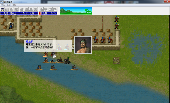 第一回合,2个友军上岸,打门口守卫的步兵,孙坚和3个壮士往右移动。敌军回合,2个水里的骑兵别管。