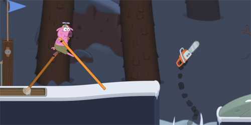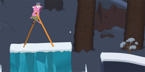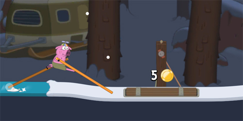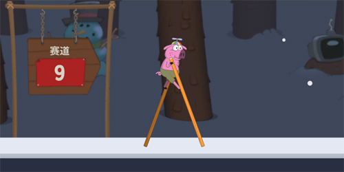 这一层第一个难度的地方就是踩着冰过来,冰地和普通的地不一样的就是冰地很滑,木杆子很可能就打滑了,就会失去平衡杆,记住一个特别的点就是不要角度拉的太开了,不然直接一滑,就直接屁股接触到冰地直接游戏失败了。