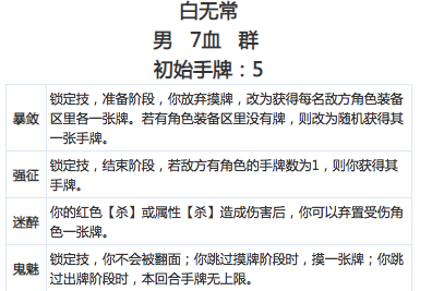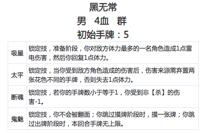 黑无常 准备阶段1伤害给血多角色,然后回血。类似界教主的梅花。受伤时有个反弹技能其实弃牌掉血问题不大。