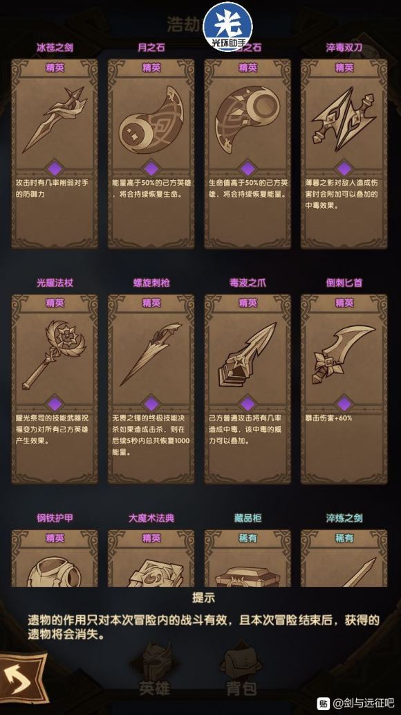 蓝色,紫色,遗物的思路是爆伤>攻击>血量防御。比较特殊的日月石优先级很高,冰火剑不是必须,当然最好有减防那一把,另外中毒打boss也很有限。