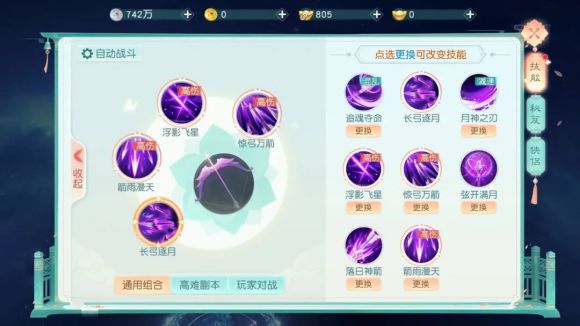组合一:浮影飞星+惊弓万箭+箭雨漫天+追魂夺命(或月神之刃)