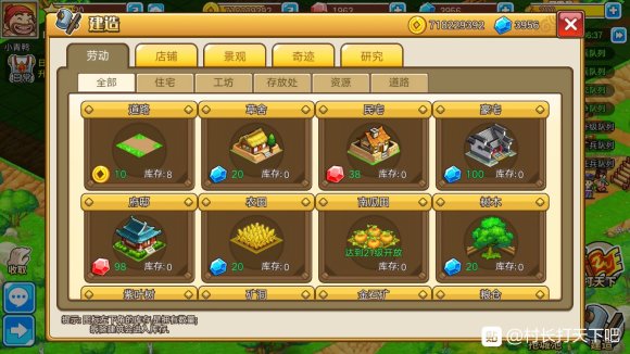 点击右下角建设,进入创造模式,里面分别有:劳动,店铺,景观,奇迹和研究。(如图)