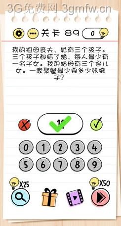 我的祖母丧夫,她有三个孩子,三个孩子都结了婚,每人最少有一名子女,我的姑母有三个侄儿女,一家聚餐最少要多少张椅子是谜题急转弯 《BrainTest》第89关的问题,很多网友不知道答案是什么,下面小编给大家带来谜题急转弯 《BrainTest》第89关攻略。